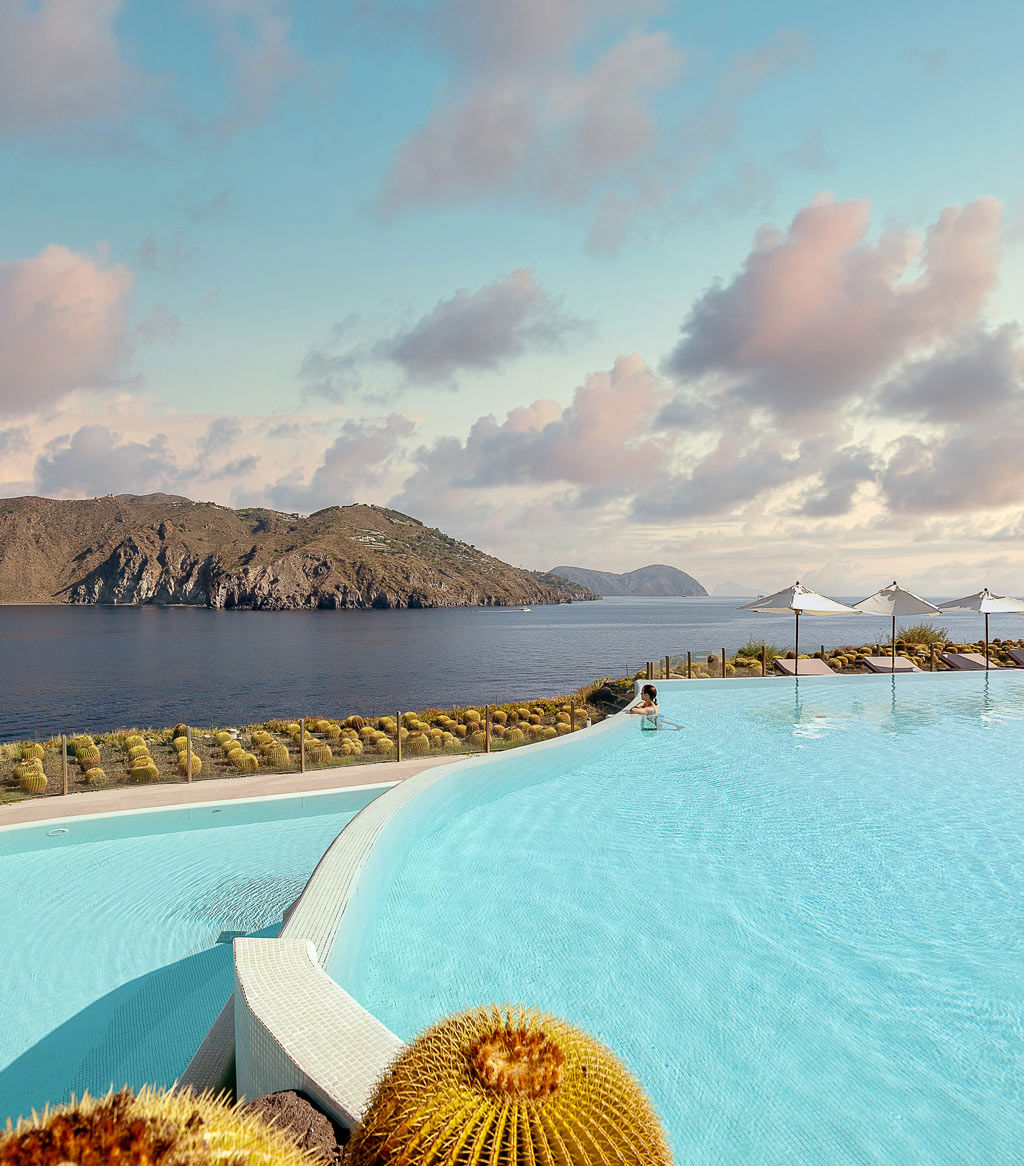 On the island of Vulcano, surrounded by the unspoilt nature of Vulcanello with the open horizon of the Mediterranean sea, lies Therasia Resort Sea & Spa. Set on a promontory overlooking the spectacular “faraglioni” of Lipari, the resort boasts enchantingly quiet surroundings and breathtaking views of the entire Aeolian Islands. Soft, light hues in contrast with the black volcanic rock, the harmonious Mediterranean architecture united and the elegant furnishings contribute to creating a warm and welcoming atmosphere.